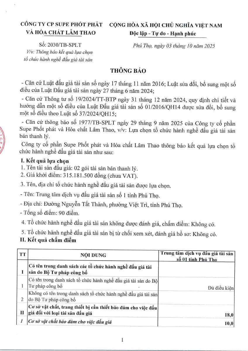 Thông báo về việc lựa chọn tổ chức hành nghề đấu giá tài sản bán thanh lý của Công ty cổ phần Supe Phốt phát và Hóa chất Lâm Thao