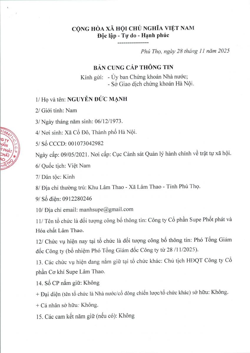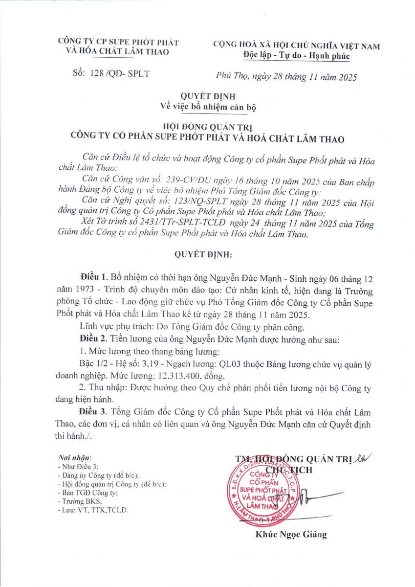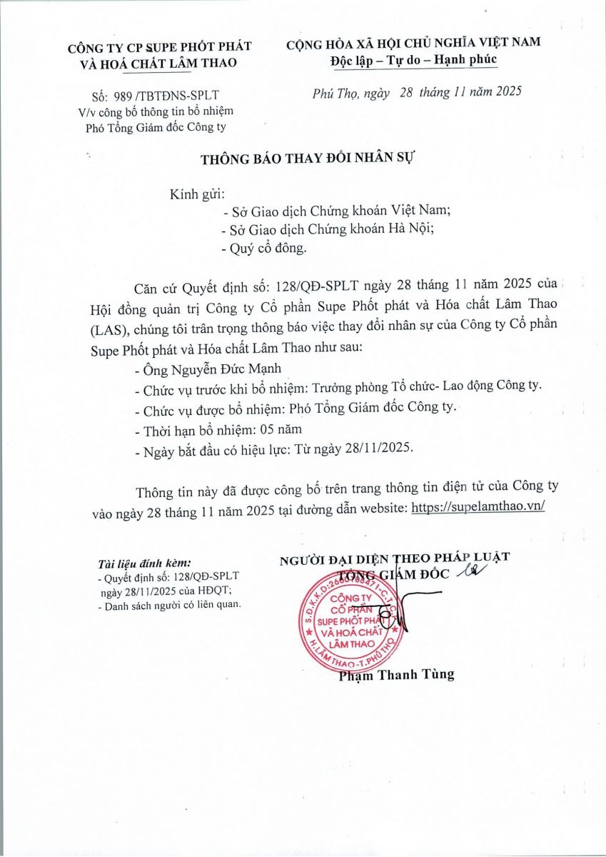Thông báo về viêc bổ nhiệm Phó Tổng Giám đốc Công ty